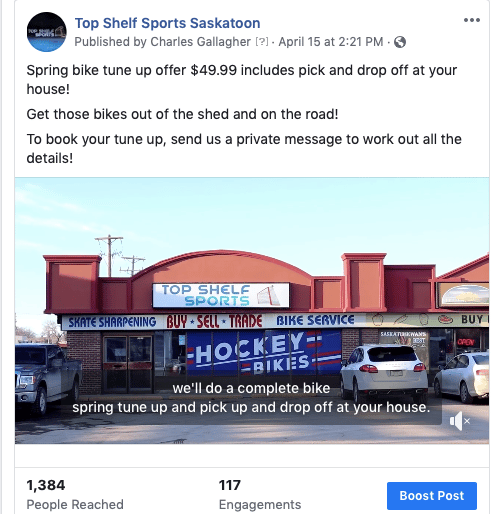 "Here is a screenshot of a brand new ad. Posted Thursday. Ad made Friday and approved right away. Spent $4 to this moment. 5 leads through Messenger. All for the bike tune up. One person has an additional bike repair. One person has 5 bikes. So estimated revenue is $470 from a $4 ad spend."